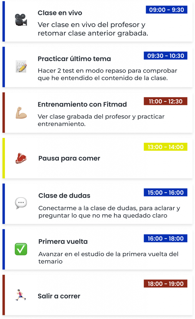 Nuestro método se basa en estrategias de estudio probadas que garantizan un aprendizaje sólido y un mejor rendimiento en tu oposición. Con una planificación adecuada, evitarás la saturación, mejorarás la retención de información y ganarás confianza en cada paso del proceso.